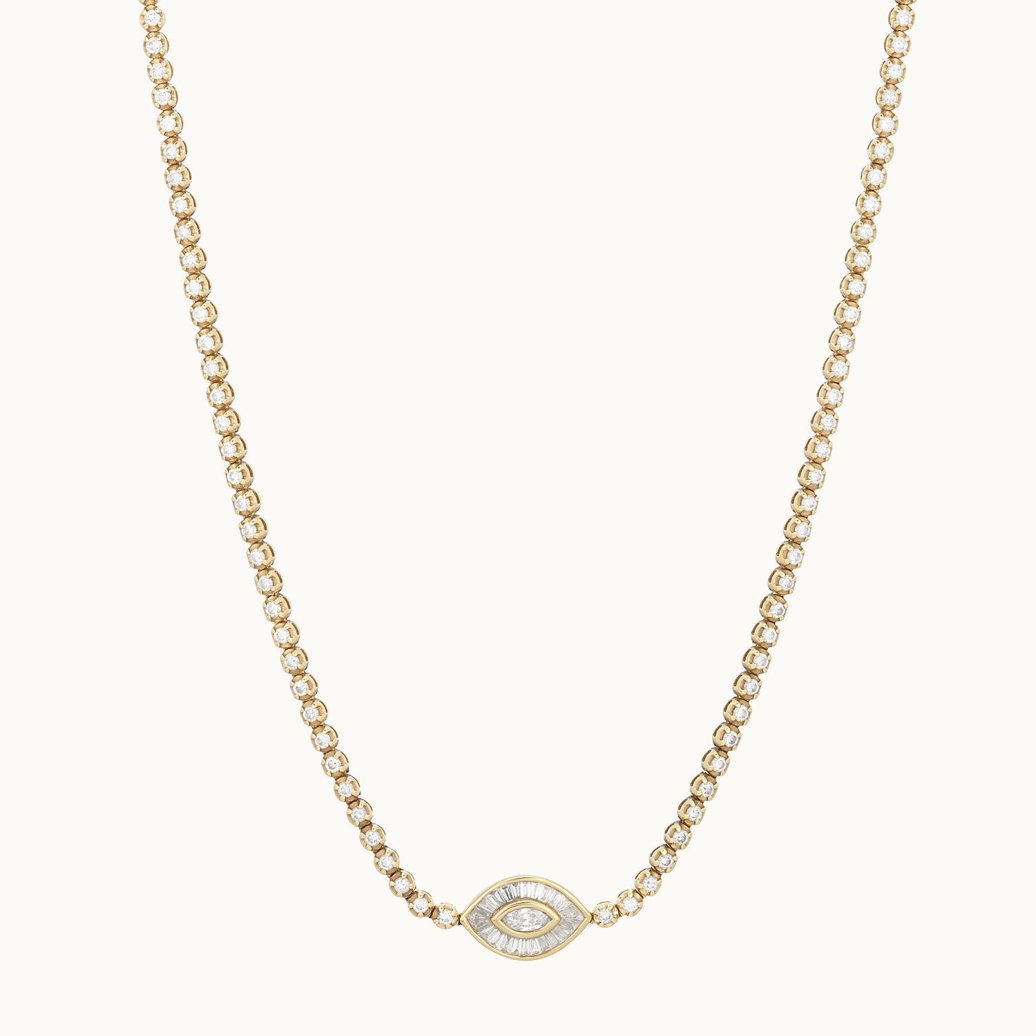 Make a statement with this stunning Marquis shaped necklace. Crafted from 18k gold, this exquisite piece features a brilliant marquis cut center diamond stone with marquis diamonds border that sparkles from every angle.