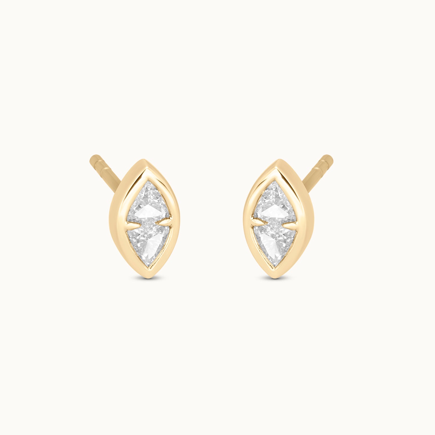 Refined sparkle with a modern edge. These marquise-shaped diamond stud earrings feature two perfectly matched triangular diamonds set within a smooth gold frame, creating a striking yet minimalist silhouette. Designed to catch the light from every angle, they offer effortless brilliance without overpowering.